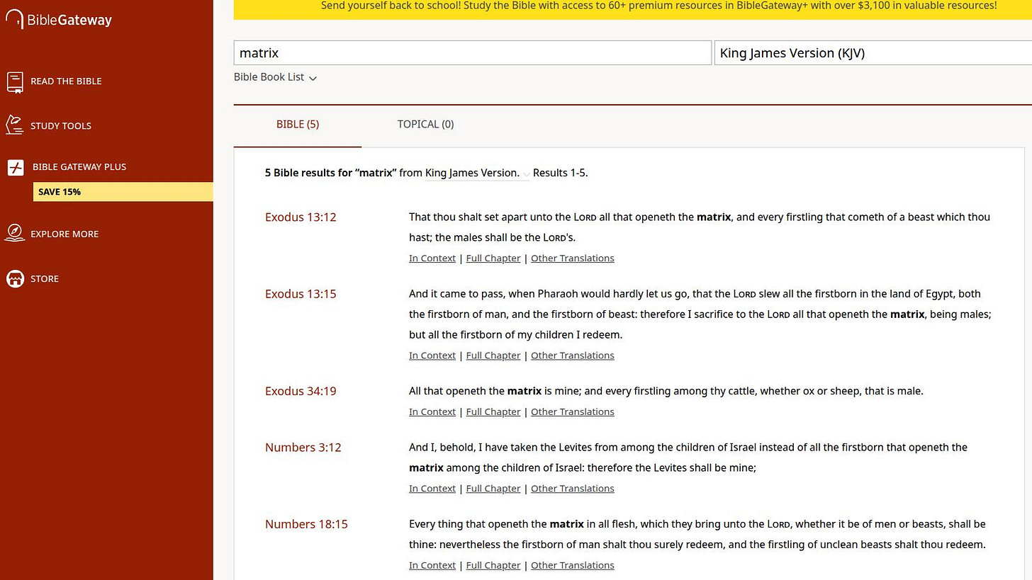 All the KJV verses that mention matrix are referring to the firstborn animals in sacrifices, and these verses all exist in the Old Testament, referring to our old nature. We are all animals being sacrificed, first born of the flesh and being sacrificed of flesh thinking to become spirit. 1 Corinthians 15:45, "The first man Adam was made a living SOUL; the last Adam was made a quickening spirit."