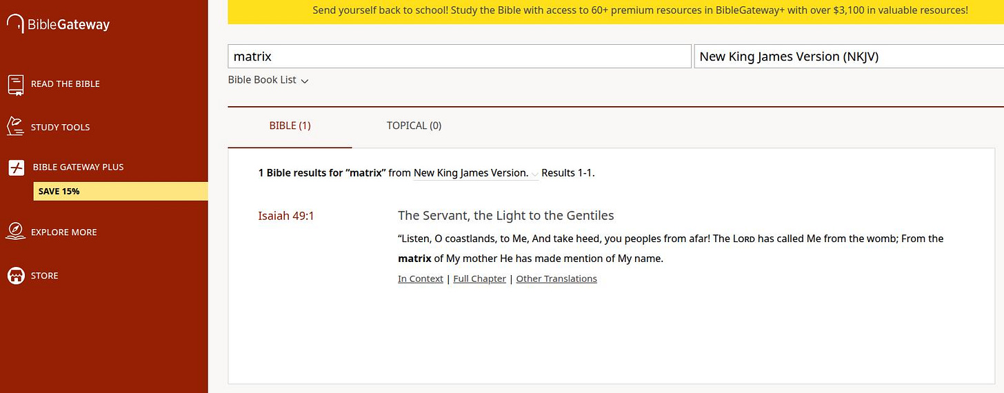 The King James Version (KJV) now has 5 verses that mention the word "matrix”. This Mandela effected word “matrix” used to only say womb, an organic reference, now changed to matrix, for greater clarity in our technologically saturated world.